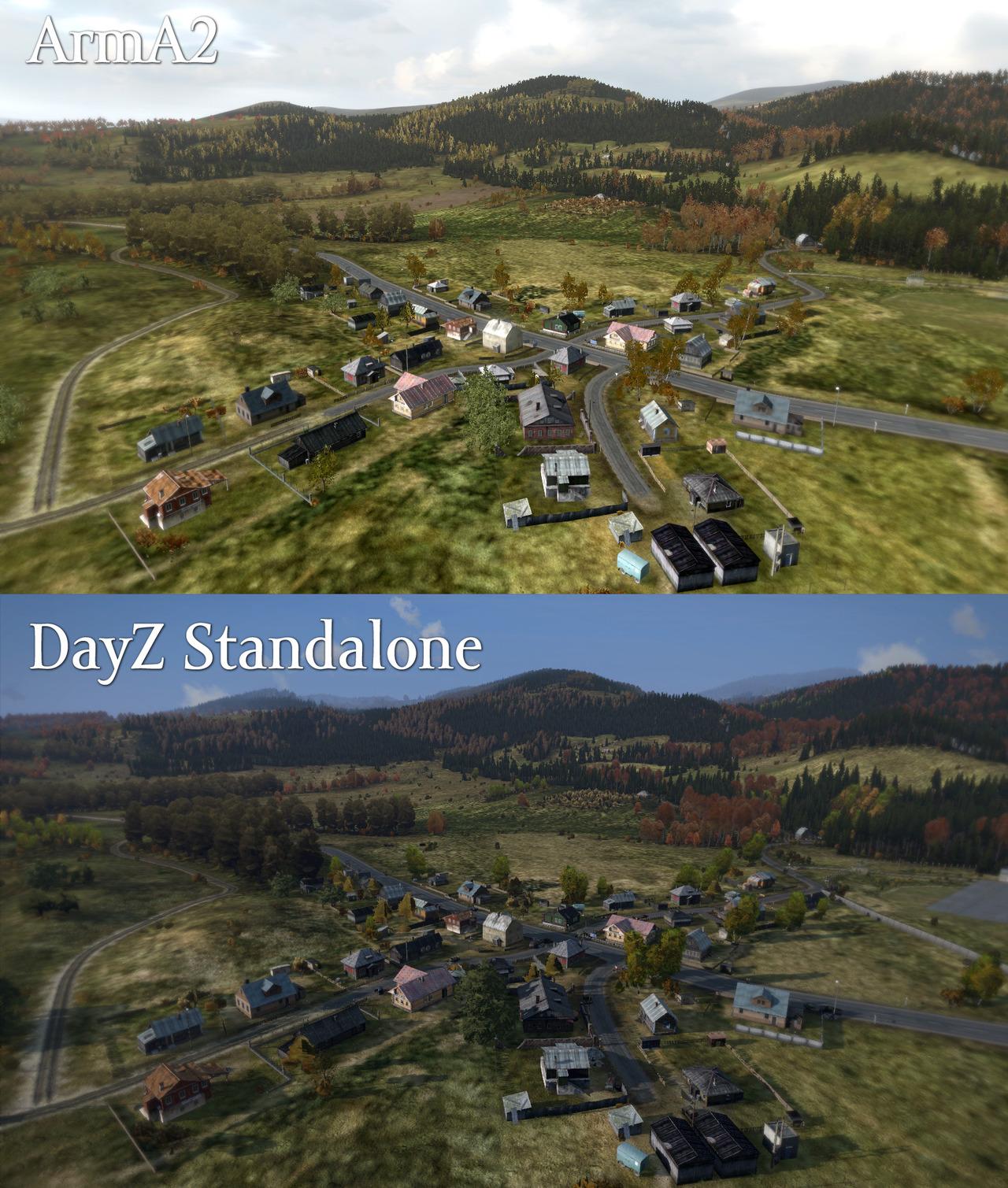 One of our Lead Artists, Mario Kurty, has been working with some of the ArmA3 artists to ensure that DayZ Standalone has the best visuals possible. The result is pretty striking when combined with some of the other improvements we have made in the engine. These improvements make the world really come to life, improving the visuals overall. A comparison screenshot is included and demonstrates the effect of this.